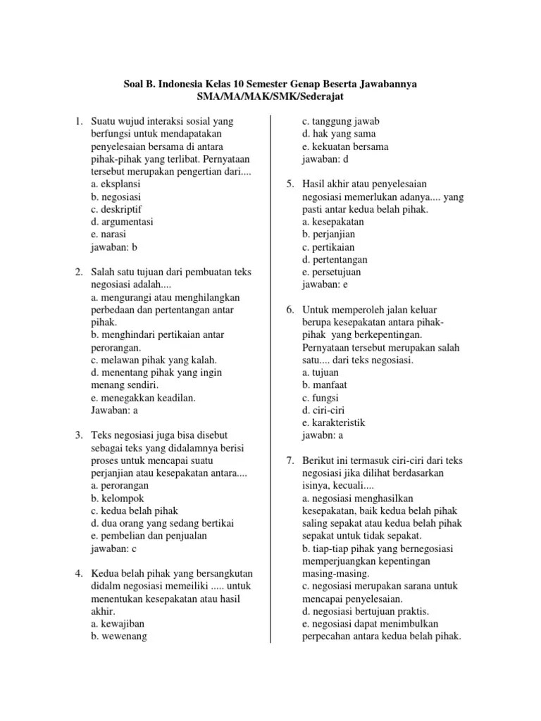 Siswa dapat mengevaluasi pengajuan, penawaran dan persetujuan dalam teks negosiasi lisan maupun tertulis. Contoh soal teks negosiasi kelas 10 mungkin anda perlukan. Soal essay bahasa indonesia kelas 10 sma ma. Contoh soal bahasa indonesia kelas x bab 11 struktur dan kaidah kebahasaan teks negosiasi. Teks negosiasi juga bisa disebut sebagai teks yang didalamnya berisi proses untuk mencapai suatu perjanjian atau kesepakatan antara.